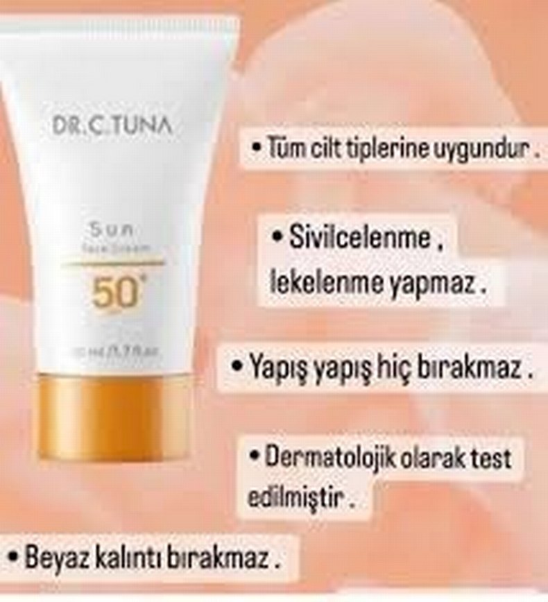 Farmasi Dr. C. Tuna SPF 50 güneş kremi tüm cilt tiplerine uygundur. Sivilcelenme ve lekelenme yapmaz, yapışkanlık bırakmaz, dermatolojik olarak test edilmiştir. ☀️