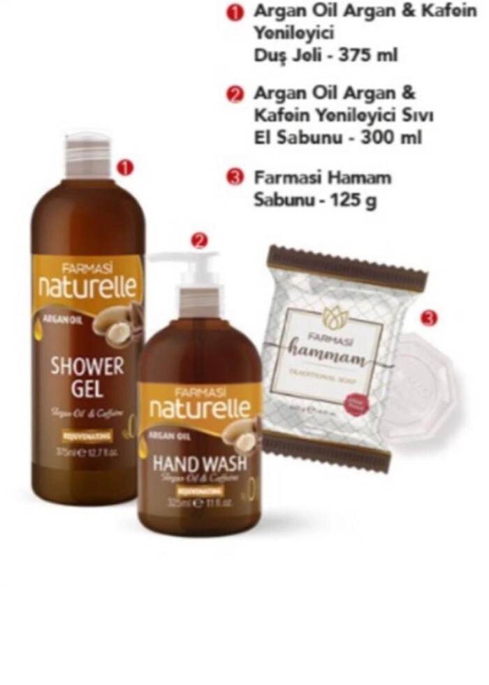 Farmasi argan yağı , kafein yenileyici duş jeli 375ml - sıvı el sabunu 300ml - hamam sabunu 125g , 3 lü paket şeklindedir. #argan #kafein #duşjeli #sabun #hamam #elsabunu #hamamsabunu #arganyağı #375ml #300ml #125g #yenileyici #farmasi