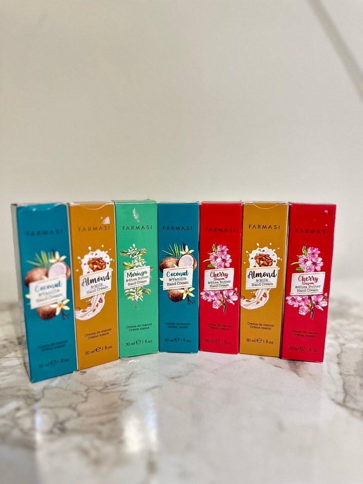 Farmasi el kremleri; hindistancevizi, badem, mango ve kiraz gibi çeşitli kokularda, 30 ml tüplerde sunulur. Eller için nemlendirici bakım sağlar.