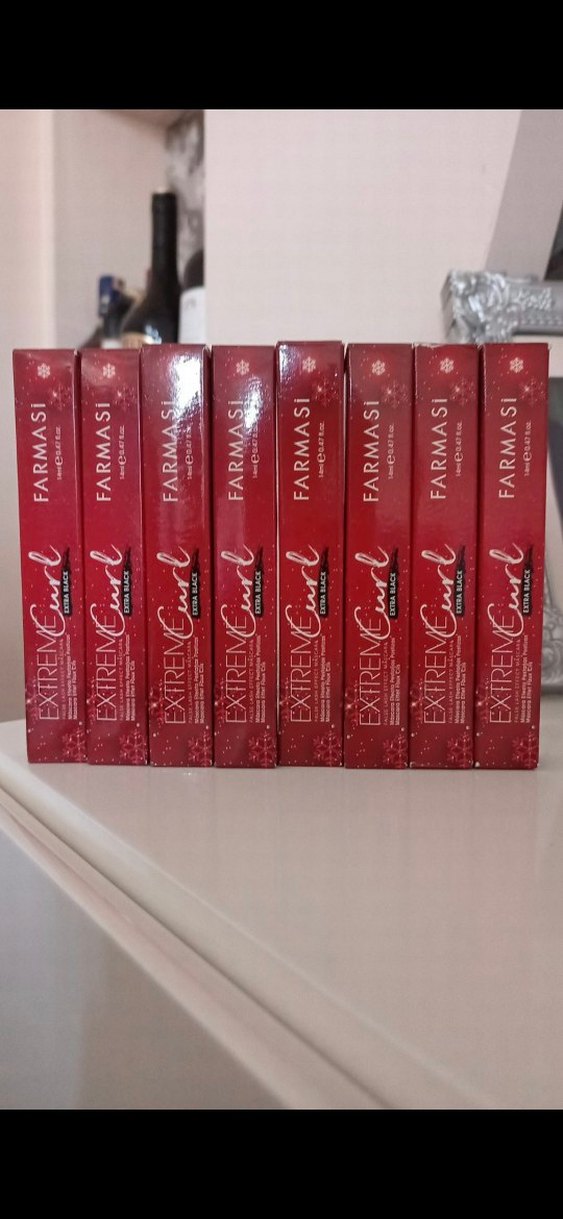 Farmasi Extreme Curl maskara, koyu kırmızı renkte, kirpikleri belirginleştirmek için tasarlanmıştır.