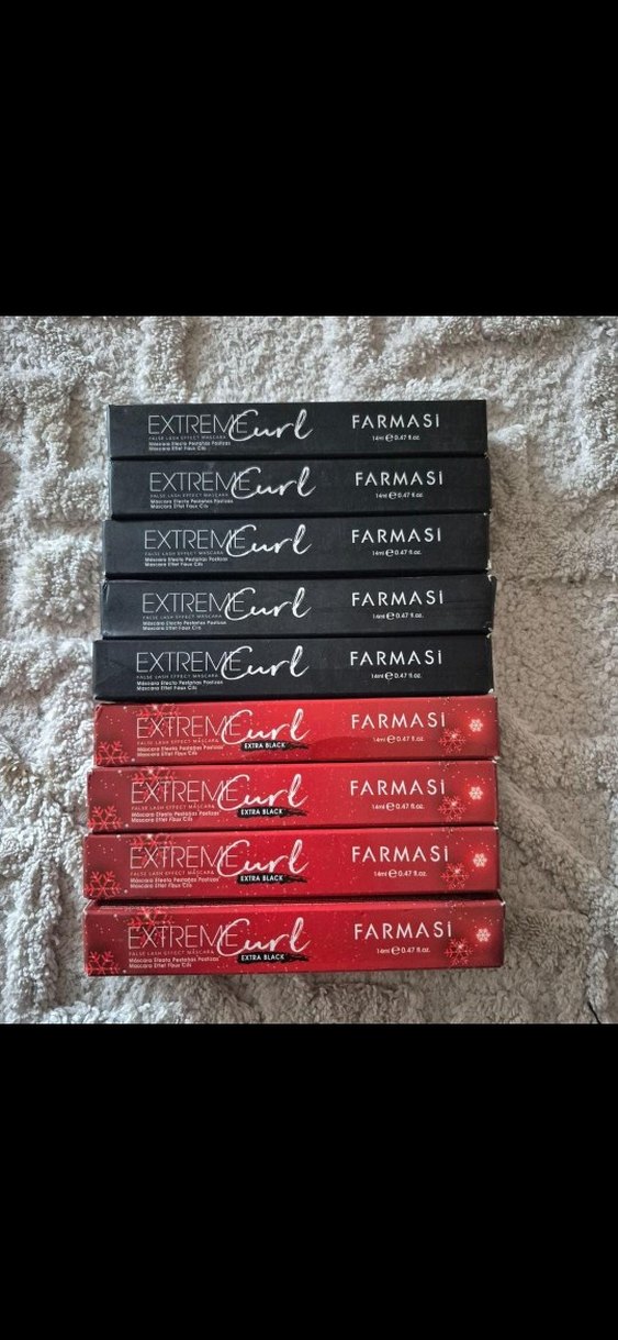Farmasi Extreme Curl maskara, koyu kırmızı ve siyah tonlarda. Kirpikleri kıvıran ve yoğun renk veren formüle sahip.
