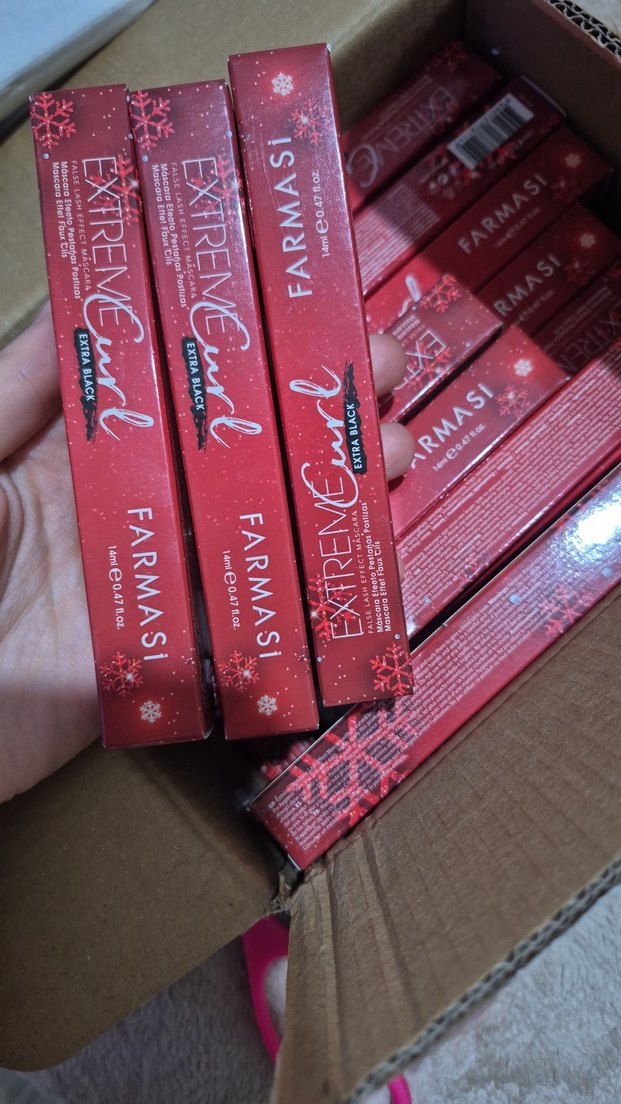 Farmasi Extreme Curl kırmızı maskara, koyu renk ve ekstra hacim sağlar. Ambalajda şık ve özel tasarım bulunur.