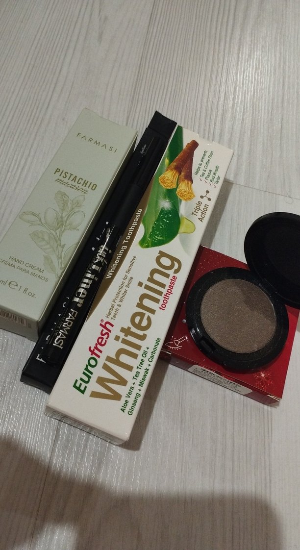 Farmasi Fıstık özlü el kremi, Eurofresh Beyazlatıcı diş macunu ve koyu bej far içeren set. El kremi besleyici, diş macunu beyazlatıcıdır. likit eyelinerda mevcuttur hepsi sıfır ürün