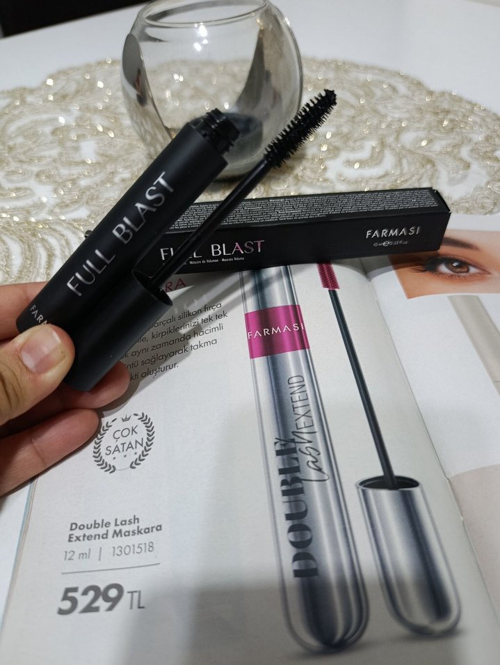Farmasi Full Blast siyah maskara, 12 ml yoğun renk ve hacim sağlar. Kirpikleri uzatan özel fırça tasarımıyla etkili sonuç verir.