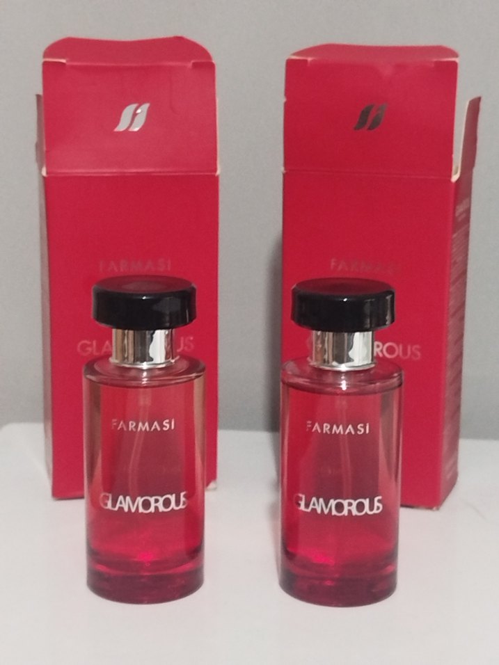 Farmasi Glamorous kadın parfümü, siyah kapaklı kırmızı şişede sunulur ve şık bir koku deneyimi sağlar. Ambalaj da şişe ile uyumludur.
