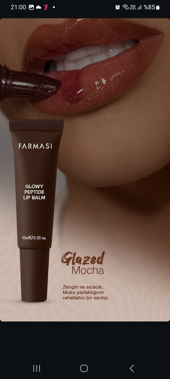 Farmasi Glowy Peptide Lip Balm Mocha, zengin ve sıcak bir parlaklık sağlar. Rahatlatıcı etkisiyle 10ml tüpte sunulur.