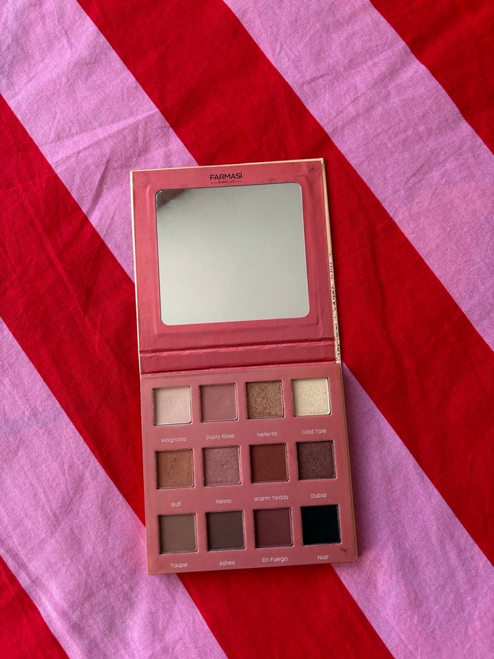 Farmasi göz farı paleti, içinde çeşitli pembe ve koyu tonlar ile birlikte aynaya sahiptir, canlı göz makyajları için uygundur.