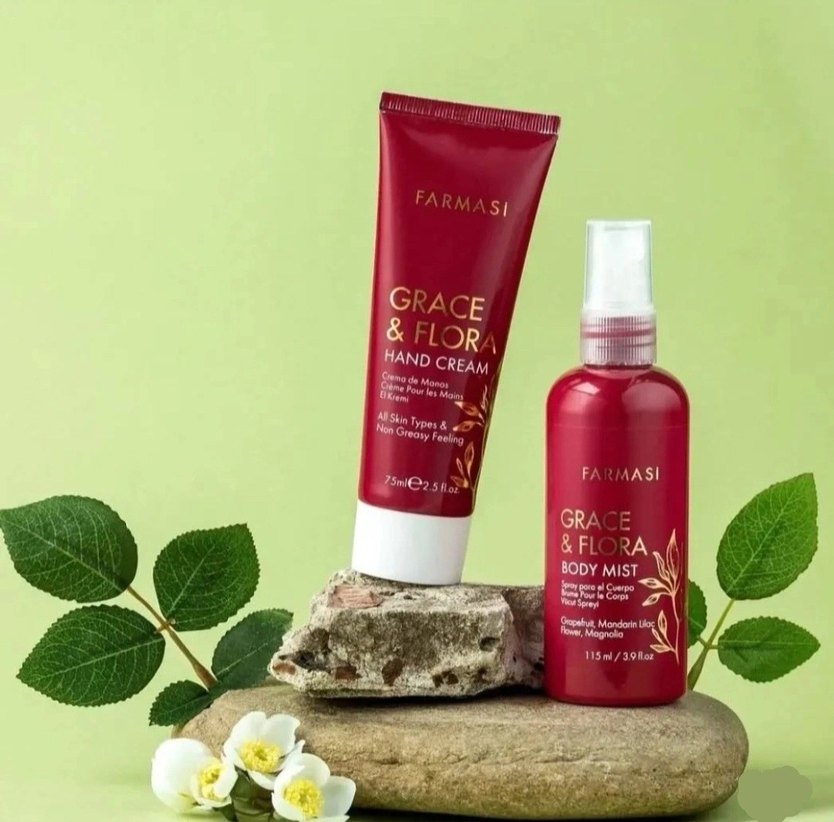 Farmasi Grace & Flora el kremi, tüm cilt tipleri için nemlendirici bakım sağlar ve yağlı his bırakmaz. 75 ml tüpte sunulur. vucut spreyi 115ml set fiyatıdır