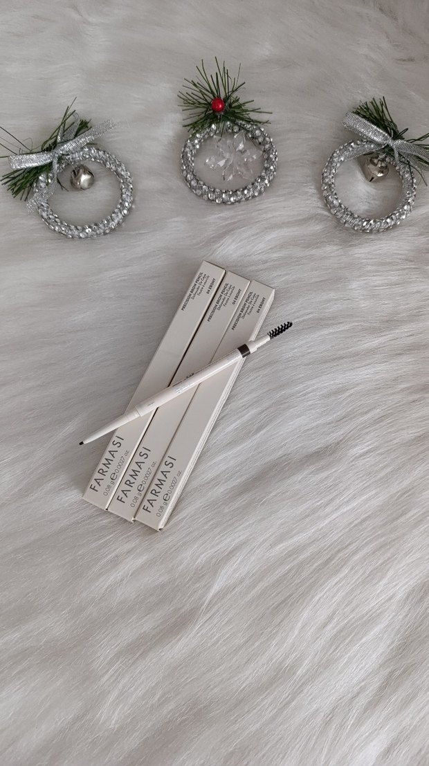 Farmasi kaş kalemi, gri renkte ve beyaz gövdeye sahip olup, kolay uygulama için fırça içerir.