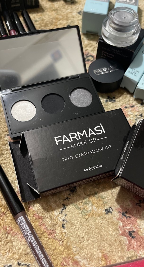 Farmasi üçlü göz farı seti, açık, koyu ve simli gri tonlarıyla çeşitli makyaj seçenekleri sunar.