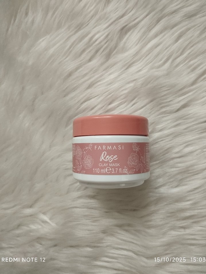 Farmasi Gül Özlü Kil Maskesi, 110 ml kavanozda, nazik kil formülü ve gül kokusuyla cilt bakımı için uygundur.