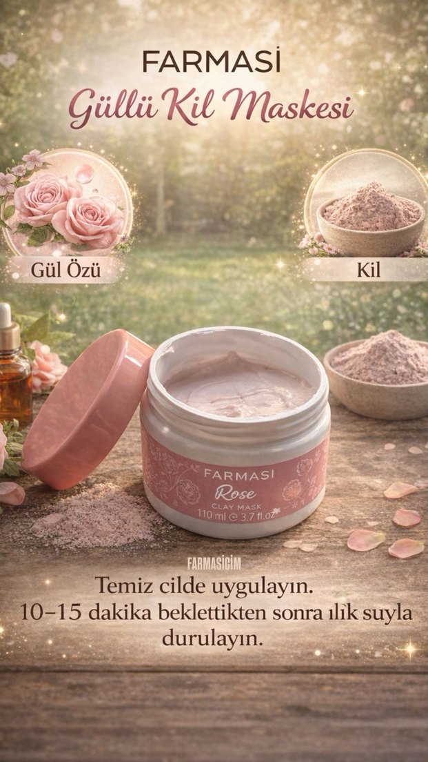 Farmasi Güllü Kil Maskesi, gül özü ve kil içerir. Temiz cilde uygulayın, 10-15 dakika bekletip ılık suyla durulayın.