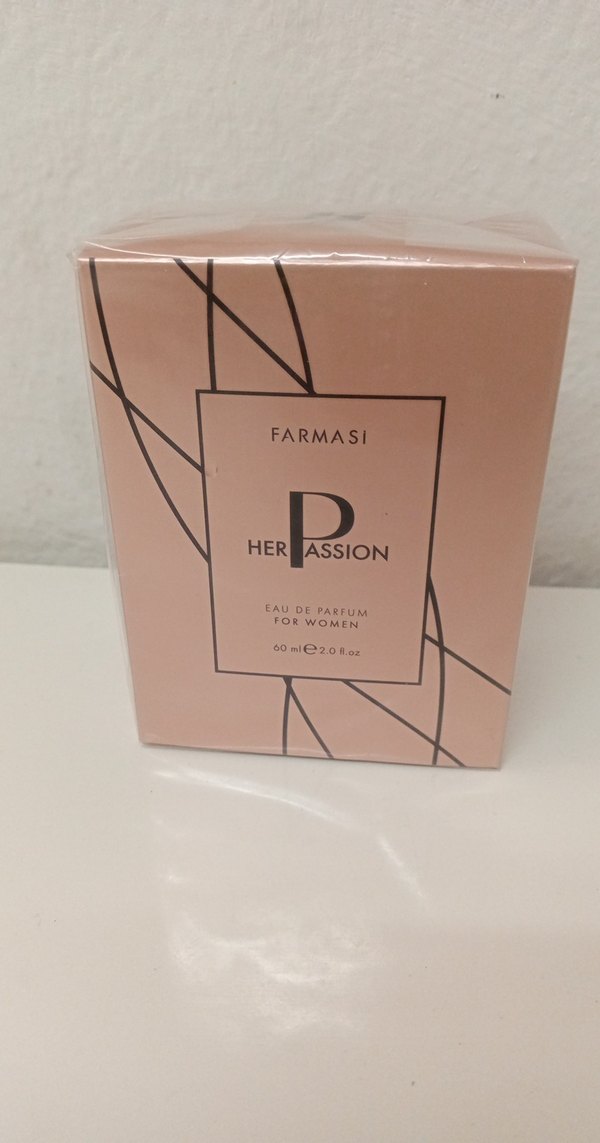 Farmasi Her Passion, 60 ml kapasiteli kadın eau de parfum. Geometrik çizgilerle süslenmiş şık, açık pembe kutuda sunulur.