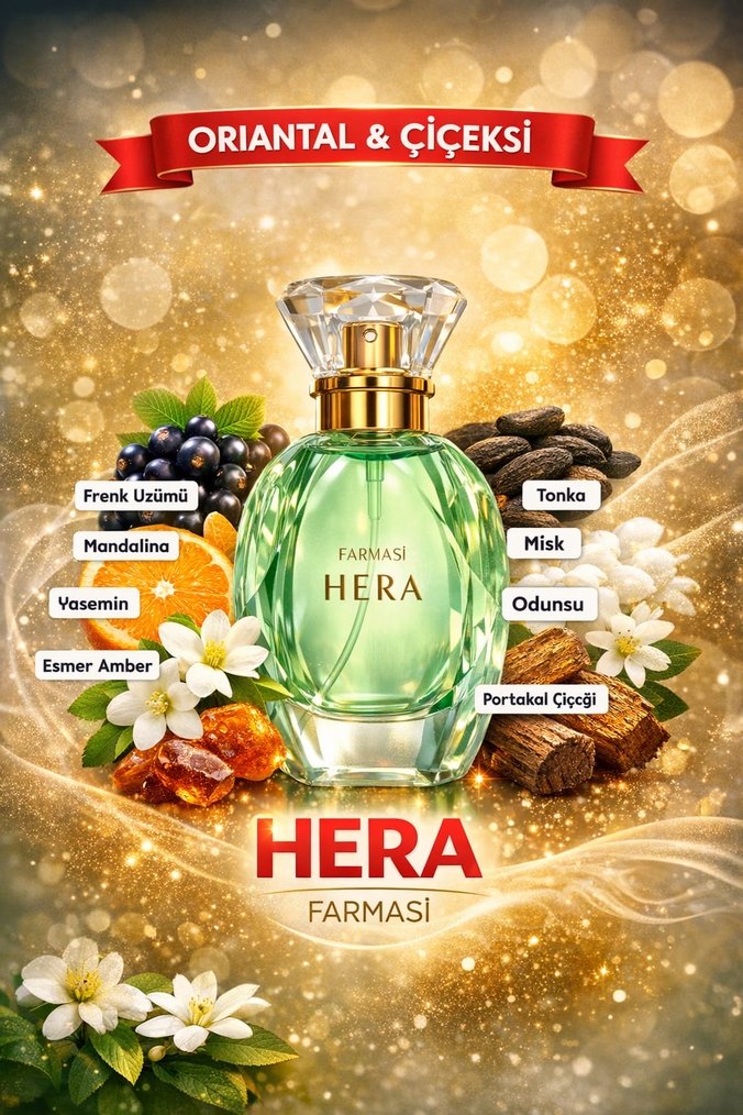 Farmasi Hera kadın parfümü, tonka, misk, mandalina, yasemin, amber ve frenk üzümü notalarıyla odunsu ve çiçeksi bir koku sunar.