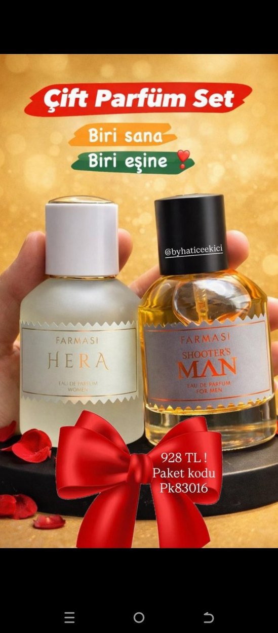 Farmasi Hera kadın ve Shooter's Man erkek parfümü, şık şişelerde. Paket kodu Pk83016, fiyatı 928 TL.