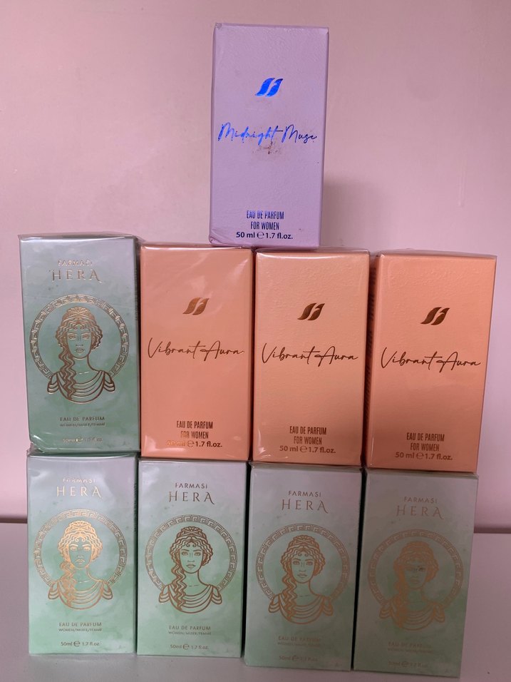 Farmasi Hera ve Vibrant Aroma kadın parfümleri 50 ml şişelerde, zarif kutularda sunulur. Midnight Magic kokusu da mevcuttur.