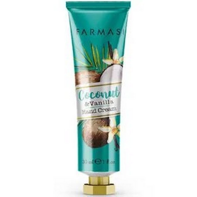 Farmasi markasına ait hindistan cevizi ve vanilya kokulu el kremi, yumuşak ve nemlendirilmiş cilt sağlar.