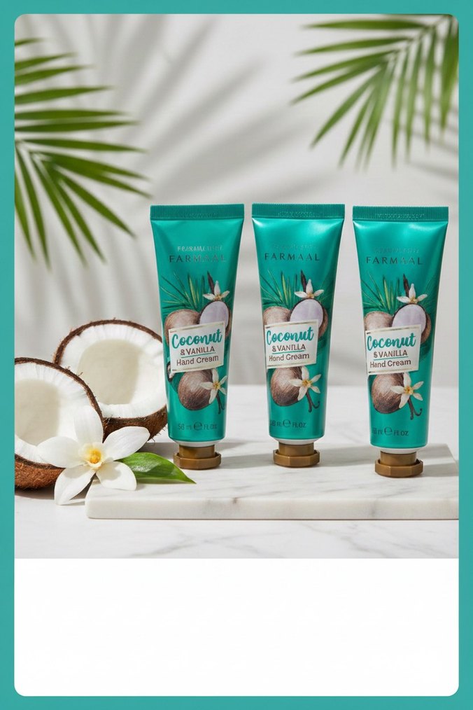 Farmasi Hindistan Cevizi & Vanilya el kremi, cildi besleyip yumuşatır. 75 ml'lik tüplerde tropikal koku sunar. 3 lu fiyat