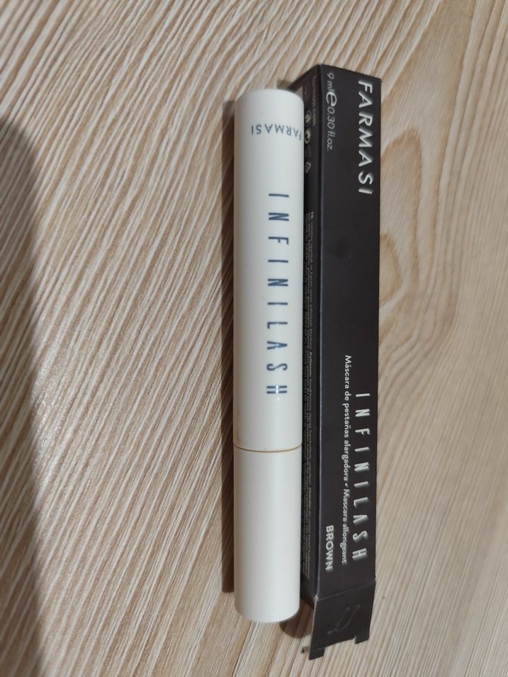 Farmasi Infinilash kahverengi maskara, kirpikleri belirginleştirir. Bej ve gri ambalaj şık bir görünüm sunar.