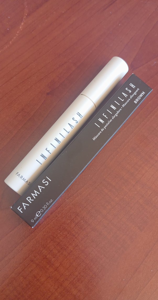 Farmasi İnfinilash kahverengi maskara, bej tüpte. Kirpikleri belirginleştirir ve kolay uygulanır.