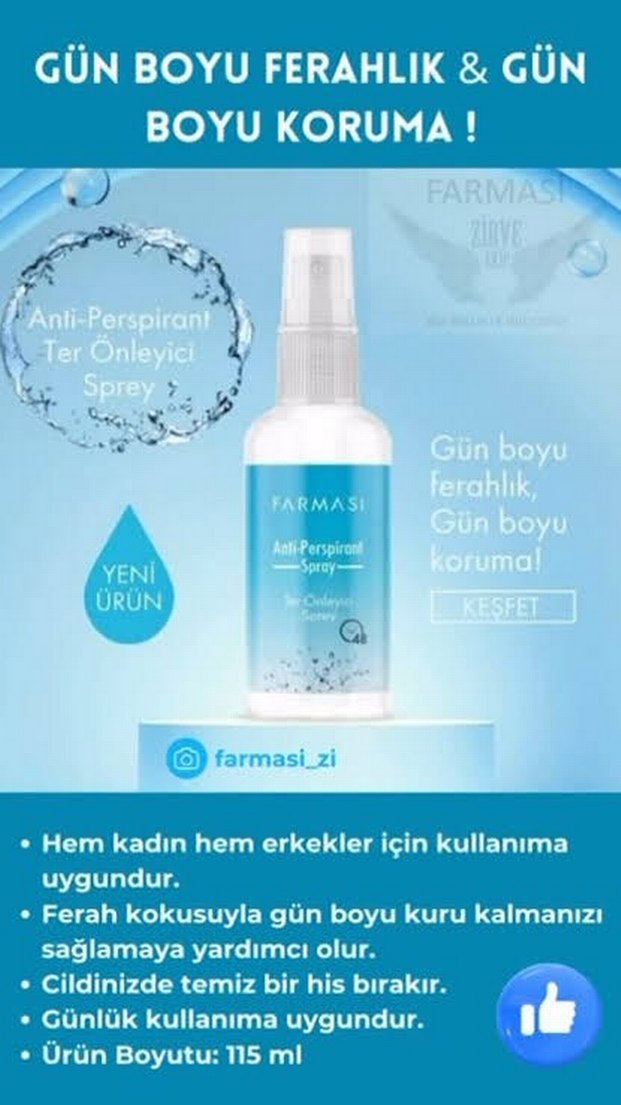 Farmasi kadın deodorant spreyi, ter ve kokuya karşı etkili koruma sağlar ve ferahlatıcı bir formüle sahiptir.