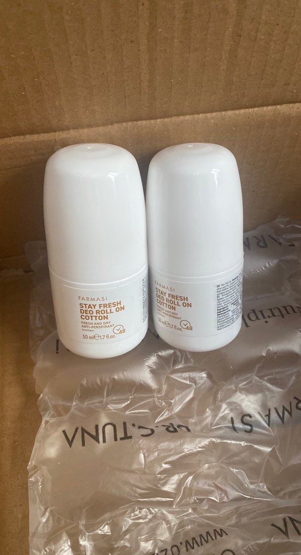 Farmasi Stay Fresh Cotton kadın roll-on deodorant, 48 saat koruma ve taze pamuk kokusu sunar, 50 ml şişede.