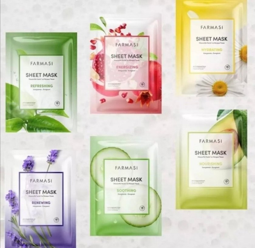 Farmasi kadınlar için nar, salatalık ve papatya gibi doğal içeriklerle canlandırıcı, rahatlatıcı, nemlendirici ve besleyici etkiler sunan kağıt maskeler.