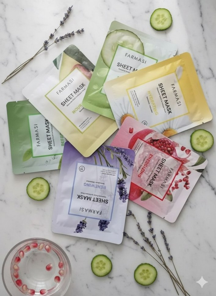 Farmasi sheet maskeleri, salatalık, papatya,avakado,yeşil çay, lavanta ve nar gibi doğal içeriklerle cildi yenileyip besler. Farklı cilt bakım ihtiyaçlarına uygundur. Elimde her üründen 5 li paketler mevcuttur. Fiyat için mesaj atabilirsiniz.
