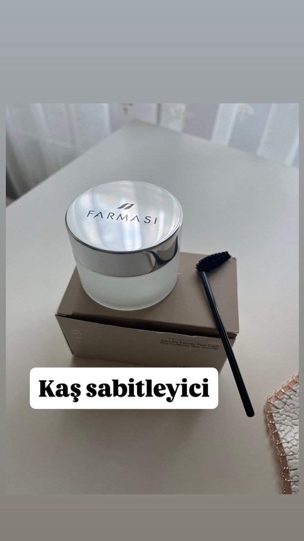Farmasi marka, kaşları sabitlemek için kullanılan gri-beyaz ambalajda kaş sabitleyici. Uygulama fırçası ile birlikte.