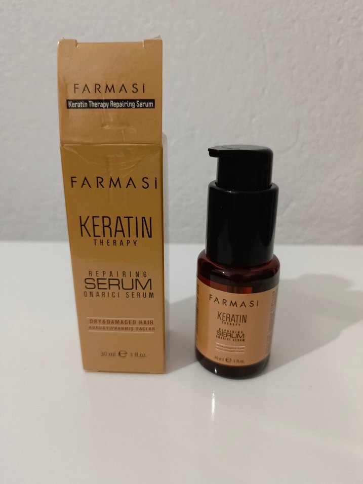 Farmasi Keratin Therapy Onarıcı Serum, kuru ve yıpranmış saçları besler ve onarır. 30 ml pompalı şişede sunulur. ♀️