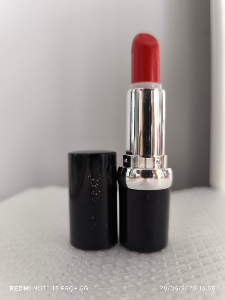 Canlı kırmızı renkte, pürüzsüz dokulu ruj. Siyah ve gümüş renkli şık ambalajda. Fotoğraf 28/06/2025 tarihinde çekilmiştir.