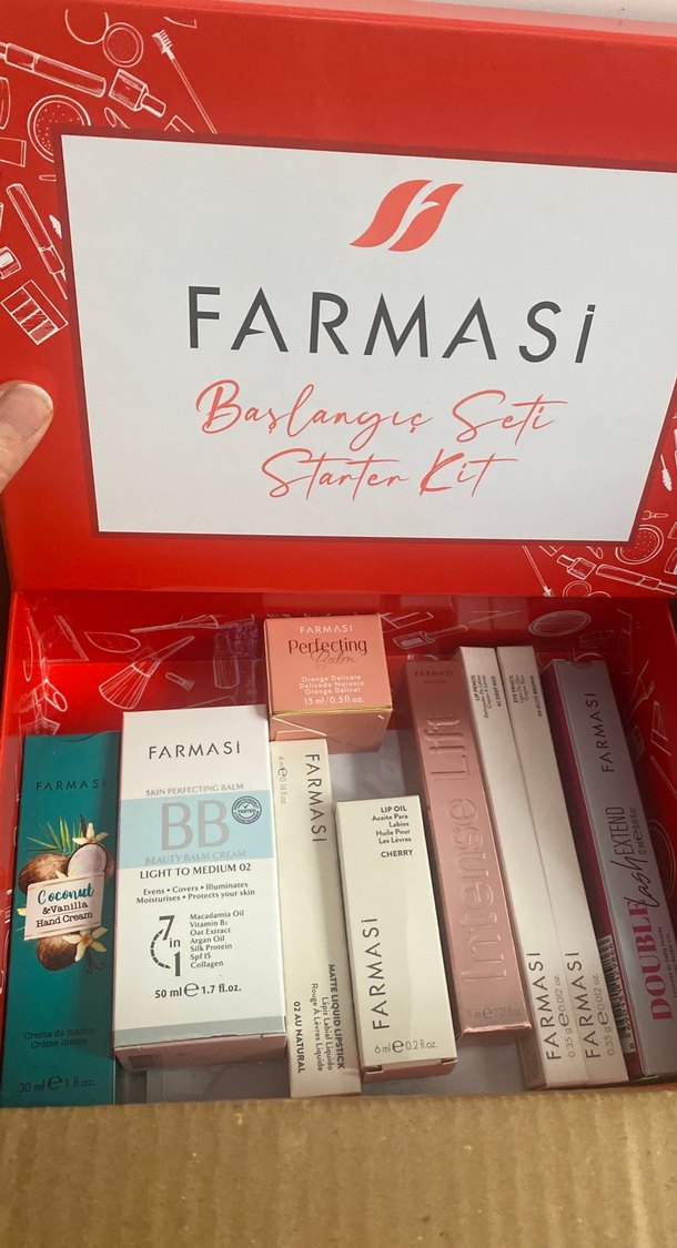 Farmasi Başlangıç Seti, açık ton BB krem ve çeşitli makyaj ürünlerini kırmızı kutuda içerir. Cilt bakımı ve kapatma için 7'si 1 arada ana krem içerir.