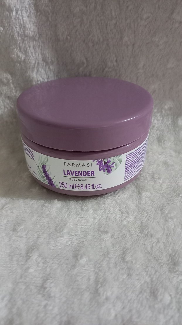 Farmasi Lavanta vücut peelingi, 250 ml ambalajda, cildi nazikçe arındırır ve rahatlatıcı lavanta kokusu sunar.