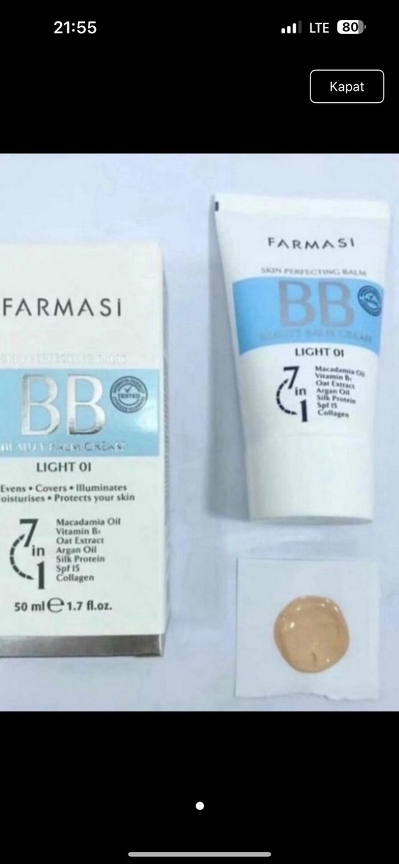 Farmasi Light 01 -02BB krem, makadamya yağı, B vitamini, yulaf özü, argan yağı, ipek proteini, SPF 15 ve kolajen ile cildi nemlendirir, korur ve aydınlatır. 50 ml. (1 adet fiyatıdir) ithal üründür