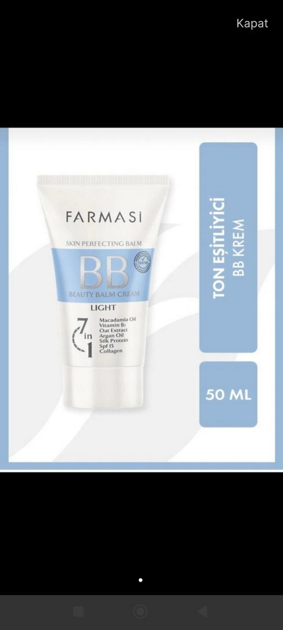 Farmasi Light BB Krem, 50 ml, makadamya yağı, vitamin B3, argan özü, ipek proteini, SPF 15 ve kolajen içerir, cilt tonunu eşitler.