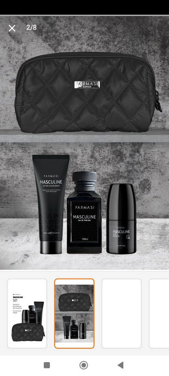 Farmasi Masculine set, tıraş sonrası balsam, parfüm ve deodorant içerir. Siyah kapitone çantasıyla geliyor. Erkek cilt bakımı için uygun.