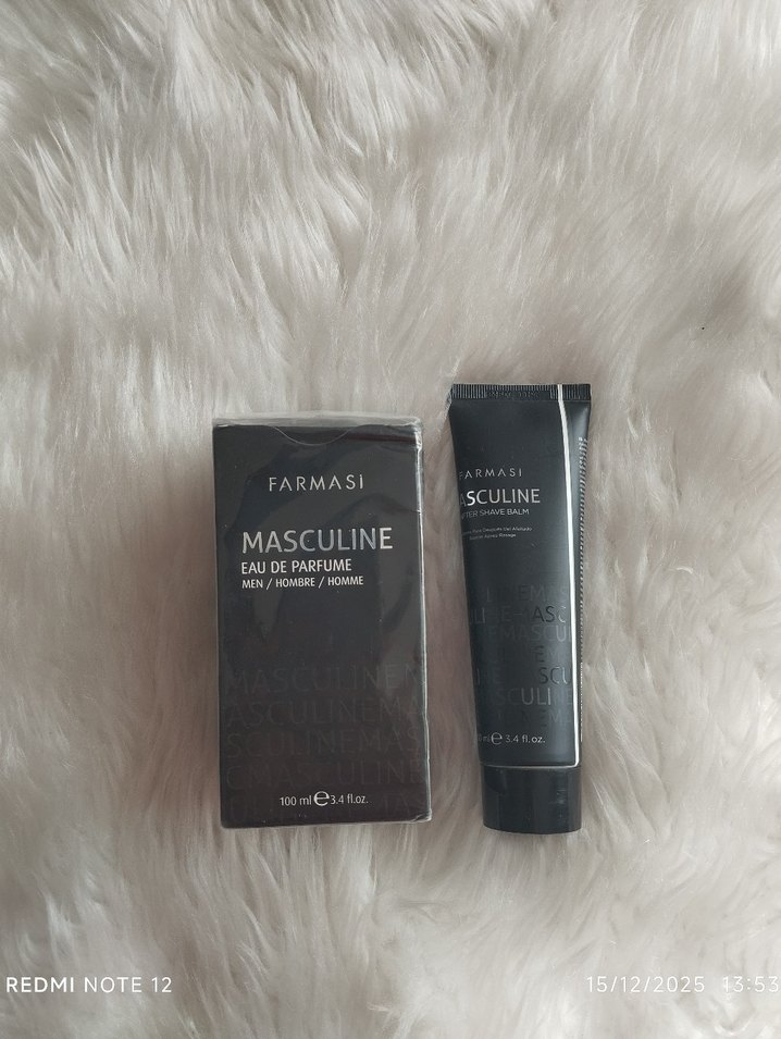 Farmasi Masculine erkekler için parfüm ve saç bakım balsamı seti. 100 ml parfüm ve 40 ml saç balsamı içerir.