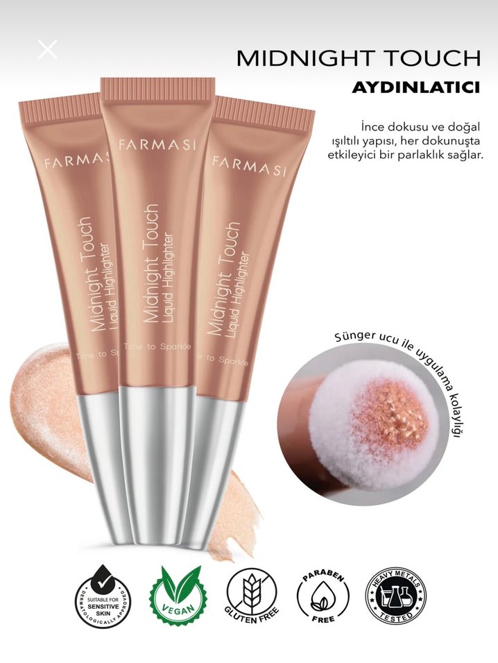 Farmasi Midnight Touch aydınlatıcı 3 adet , ince dokusu ve doğal ışıltılı yapısıyla etkileyici bir parlaklık sağlar. Sünger uçlu uygulama kolaylığı sunar. Vegan, glütensiz ve paraben içermez.