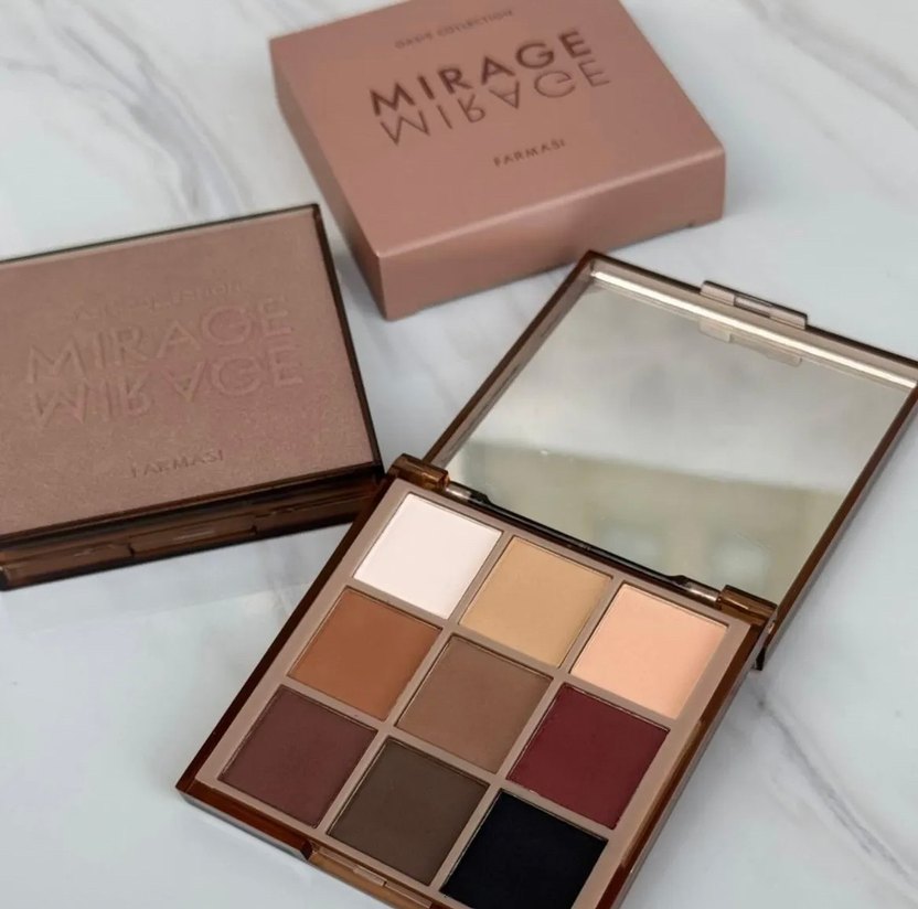 Farmasi Mirage göz farı paleti, bej ve uyumlu tonlarda dokuz açık ve canlı renkten oluşur. Kompakt tasarımda ayna bulunur. ✨