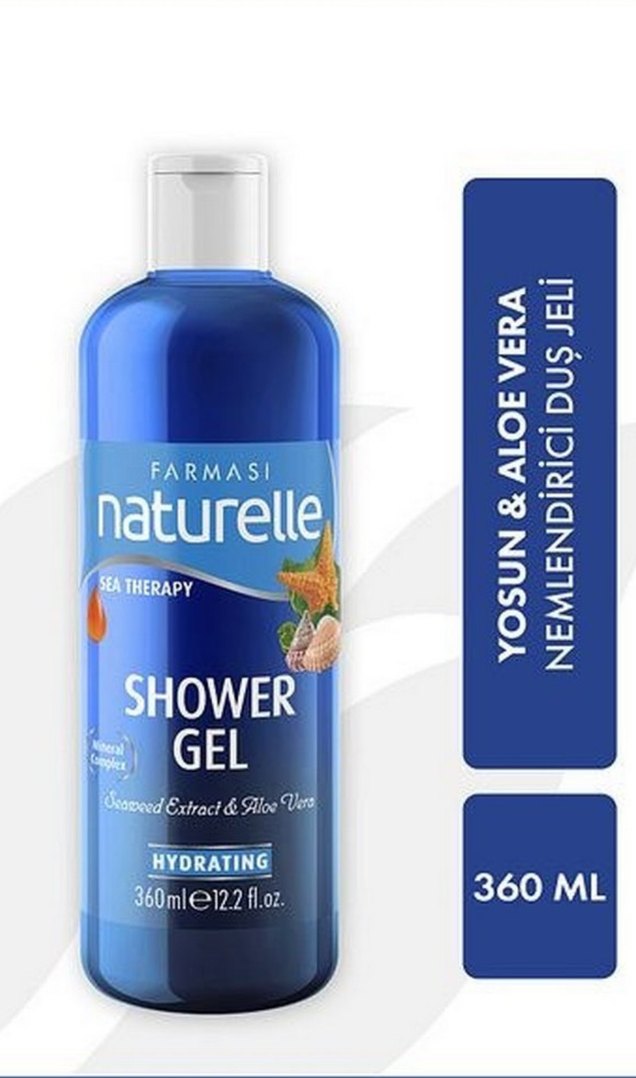 Farmasi Naturelle Sea Therapy duş jeli, yosun özü ve aloe vera içerir. 360 ml, nemlendirici ve nazik temizleyici.