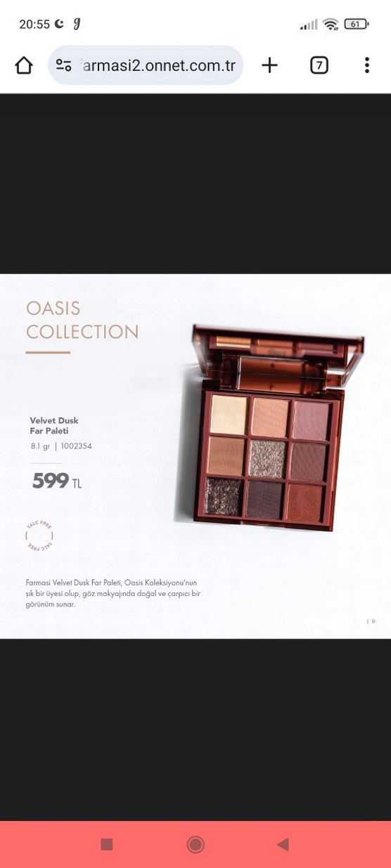 Farmasi Oasis Velvet Dusk far paleti, koyu bej tonlarla doğal ve etkileyici bir göz makyajı sunar. 8,1 gr üründen oluşur ve Oasis Koleksiyonu'nun parçasıdır. ️diğer ürünler ise aydınlatıcı allık ve göz far paletlerinden oluşmaktadır.adet fiyatıdır...