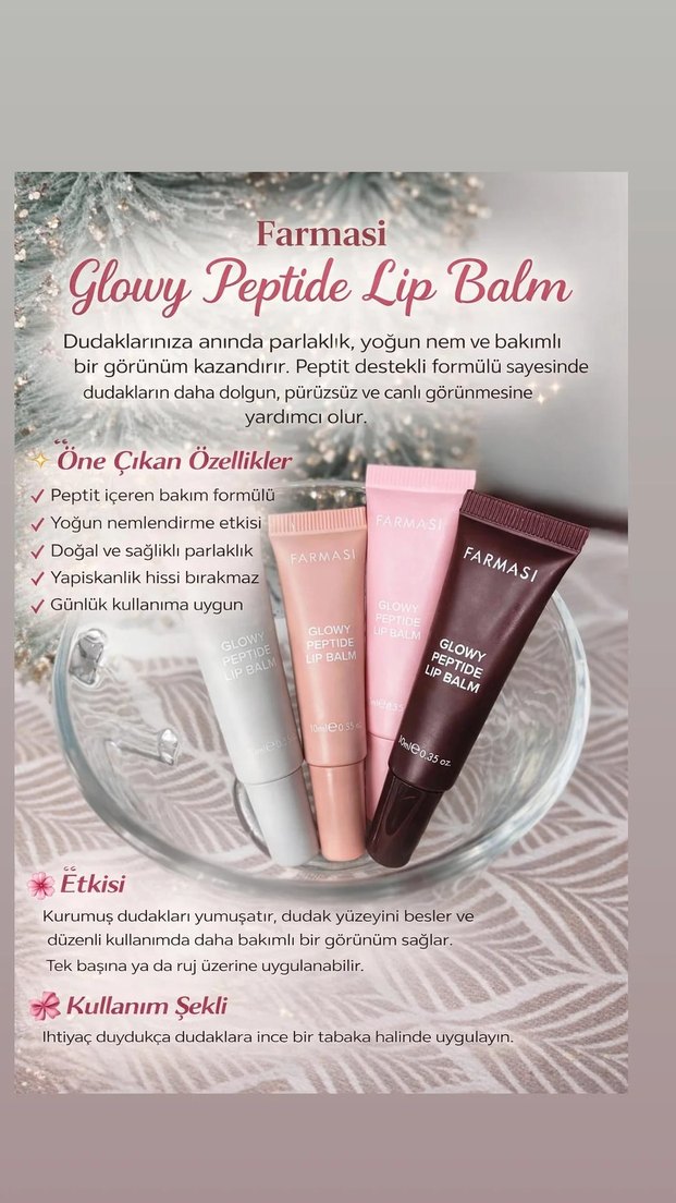 Farmasi Glowy Peptide Lip Balm, dudaklara anında parlaklık, yoğun nem ve bakım sağlar. Peptit destekli formülü dudakların dolgun, pürüzsüz ve canlı görünmesine yardımcı olur. Yapışkanlık hissi bırakmaz, kuru dudakları yumuşatır ve besler. Günlük kullanıma uygundur, tek başına ya da ruj üzerine uygulanabilir.