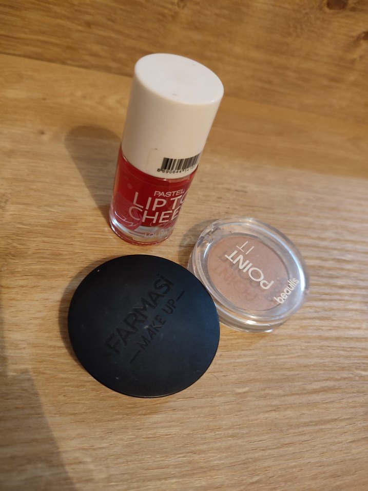 Kırmızı dudak tonu, açık bej far ve koyu renk Farmasi kompakt pudra içeren makyaj seti.