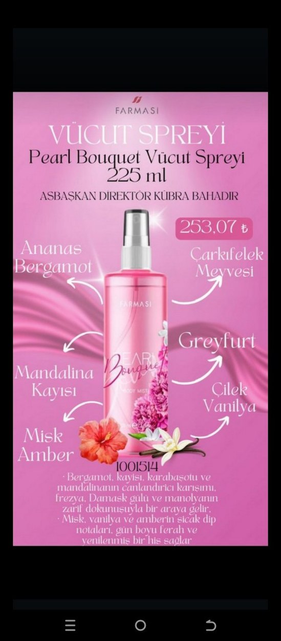 Farmasi Pearl Bouquet vücut spreyi, bergamot, kayısı, mandalina ve çarkıfelek meyvesiyle misk ve amber notalarını frezya, damask gülü ve manolya zarif dokunuşuyla birleştirir.