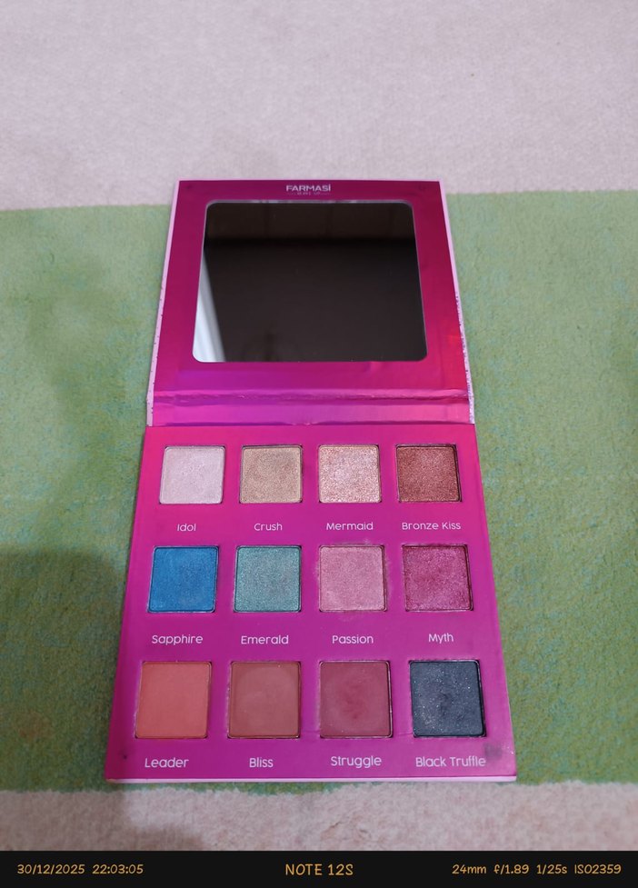 Farmasi göz farı paleti, zümrüt ve safir gibi renklerin yanı sıra parlak ve mat pembe tonları içerir. Uygulama için aynası vardır. sadece bir kaç defa kullanıldı temiz