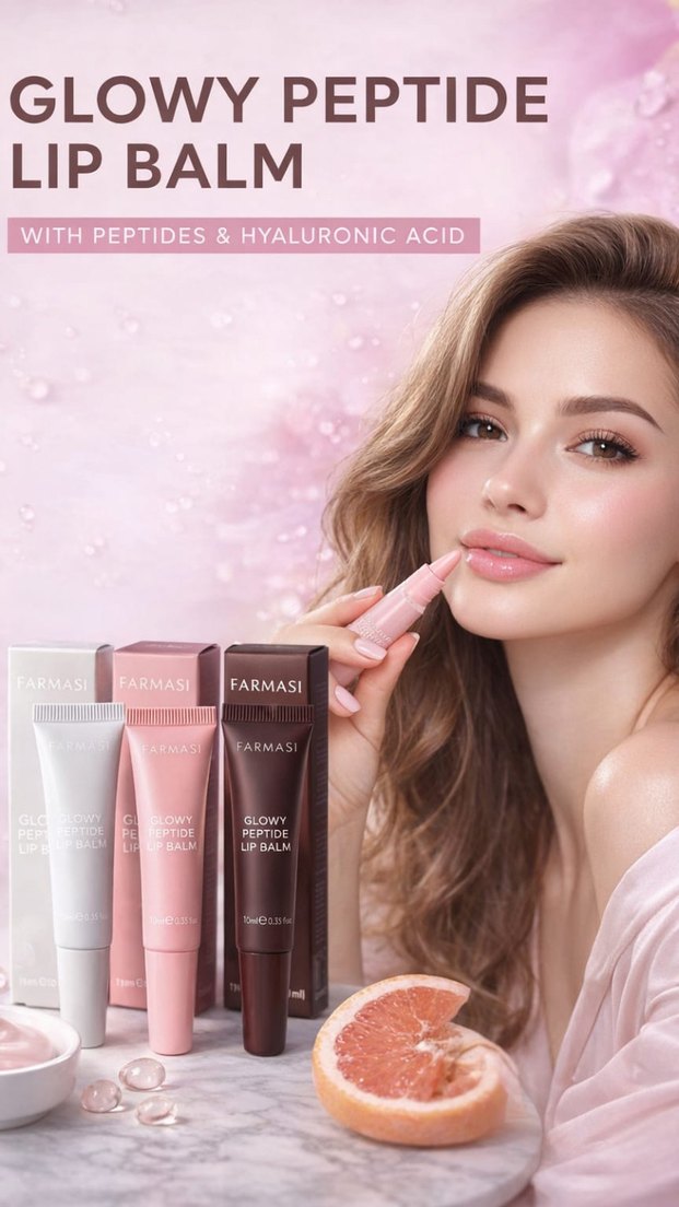Farmasi dudak balmı, peptitler ve hyaluronik asit ile dudakları nemlendirir ve bakım yapar. Pastel bej renktedir.