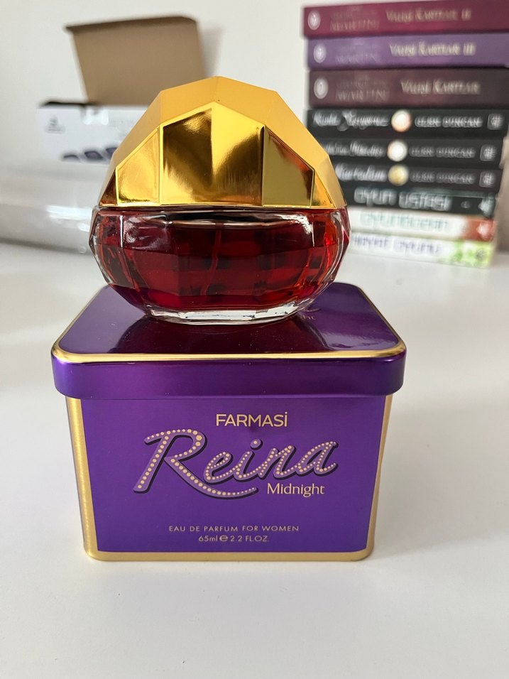Farmasi Reina Midnight kadın parfümü, 65 ml şişede, mor ve altın renkli özel tasarıma sahiptir. Kalıcı ve zarif bir koku sunar.