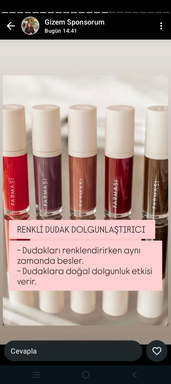 Farmasi renkli dudak dolgunlaştırıcı, dudakları renklendirirken aynı zamanda besler ve doğal dolgunluk etkisi verir. Kırmızı tonunda.