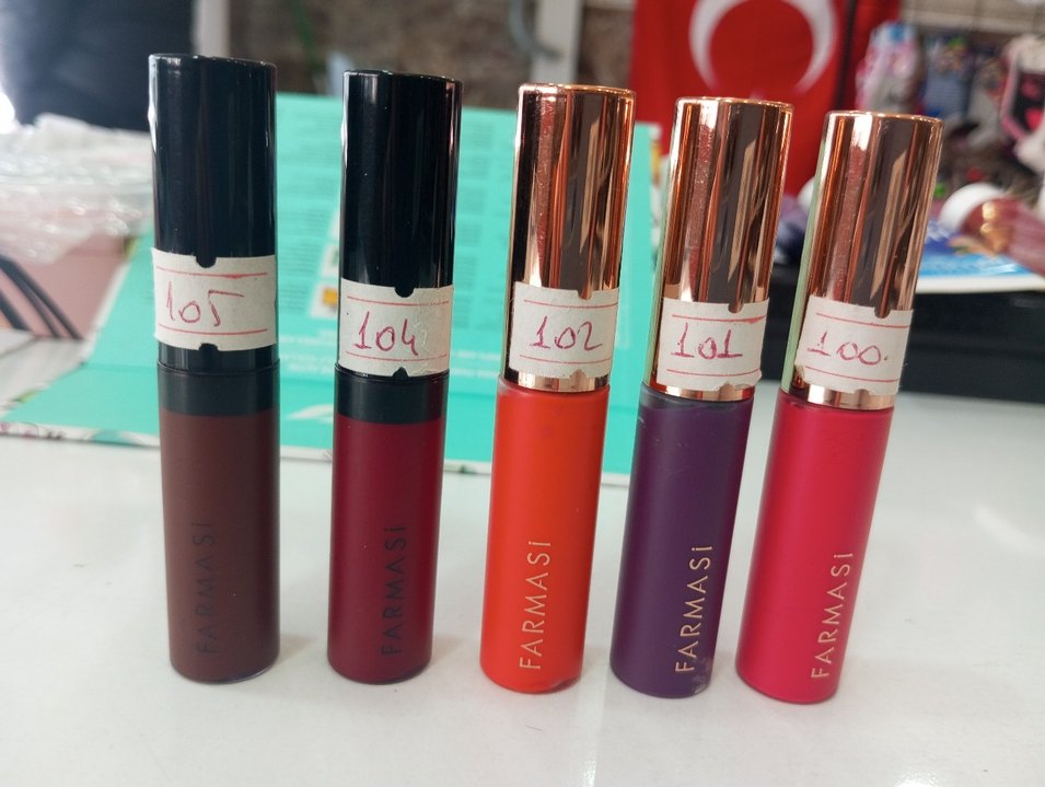 Farmasi markalı, parlak kapaklı, canlı kırmızı tonlarında rujlar. Canlı makyajlar için uygun.