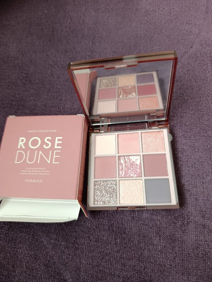 Farmasi Rose Dune göz farı paleti, mat ve ışıltılı dokularda açık pembe ve nötr tonlar sunar.